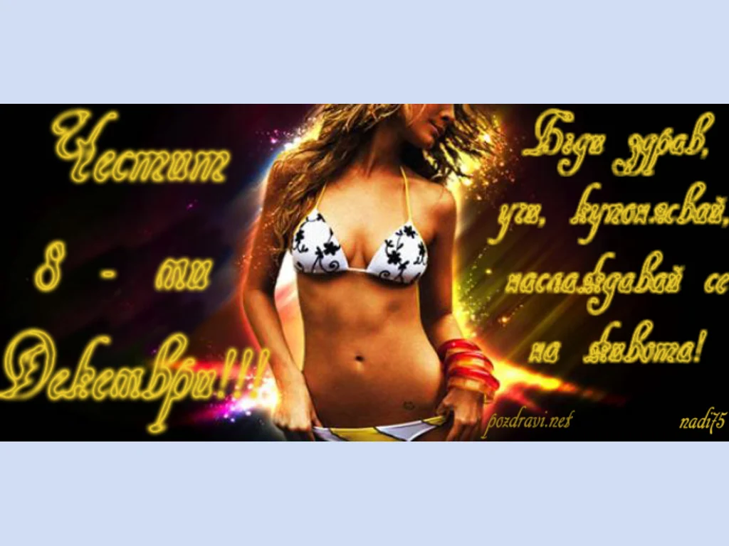 Ключови фрази: Картичка празник честит осми декември студентка бански купон наслада живот светлини дискотека танци