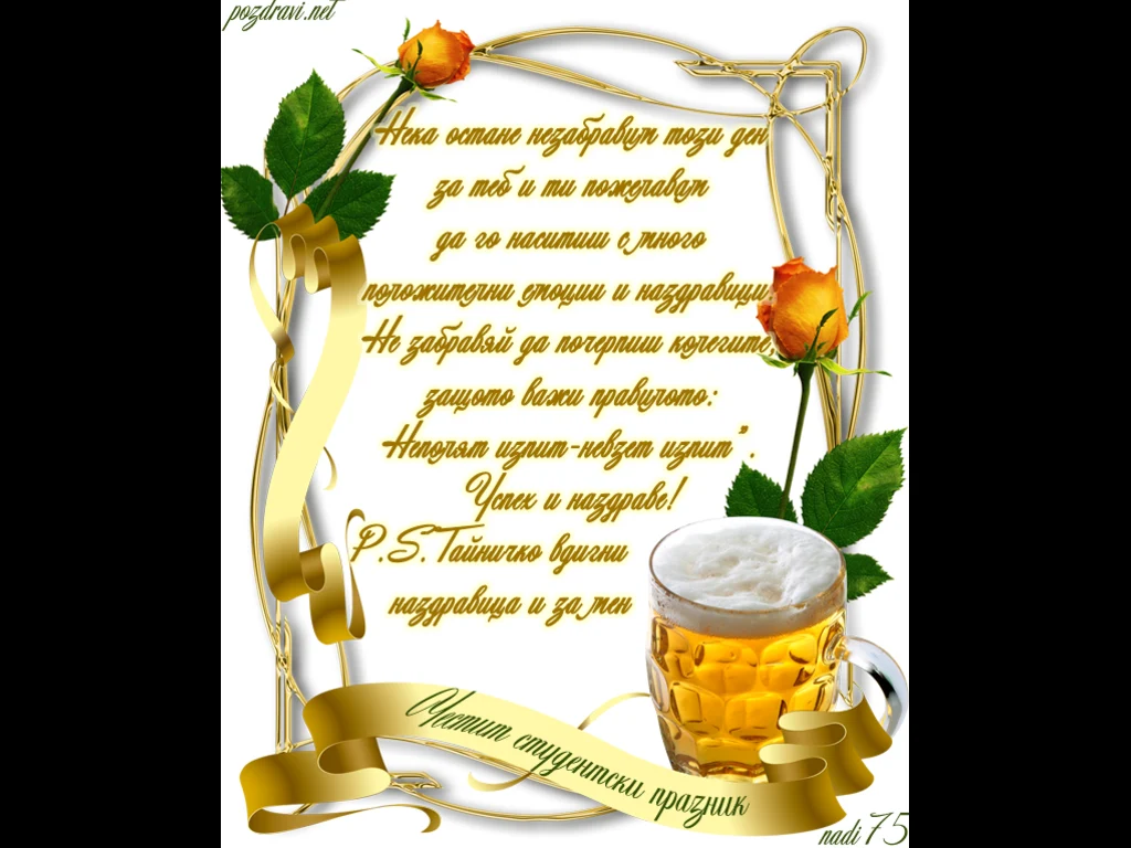 Ключови фрази: Рисувана картичка пожелание осми декември пълна чаша халба бира цветя рози емоции наздравица колеги състуденти купон