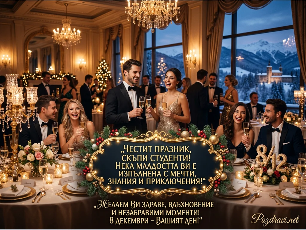 Ключови фрази: Празник на студентите, 8 декември поздрав, Коледно тържество, Елегантни млади хора, Луксозно събитие