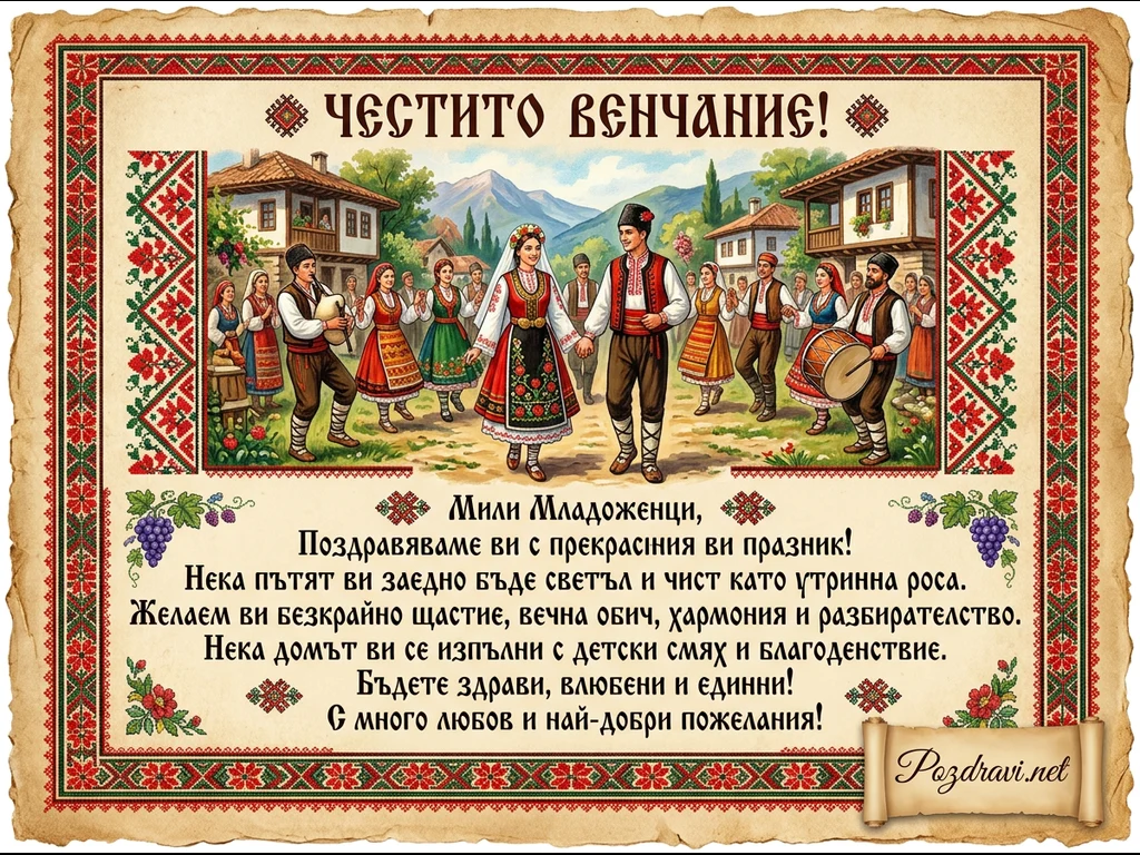 Ключови фрази: Българска сватбена картичка, Честито венчание, Традиционни носии, Фолклорна сватба, Поздрави за младоженци