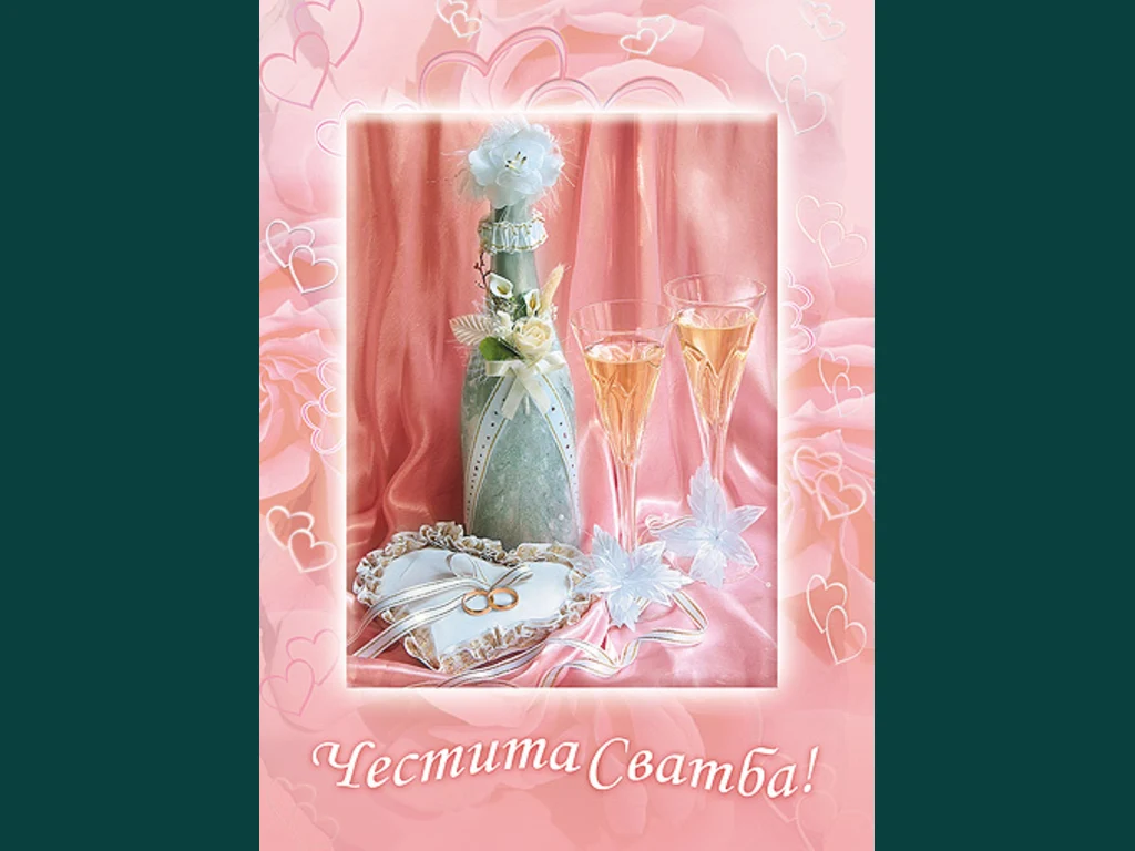 Ключови фрази: Красива изискана розова нежна картичка честита сватба шампанско бутилка бяла панделка розички коприна сатен сърце вярност завинаги украса оригинална кристални свързани пълни чаши наздравица тост пръстени халки