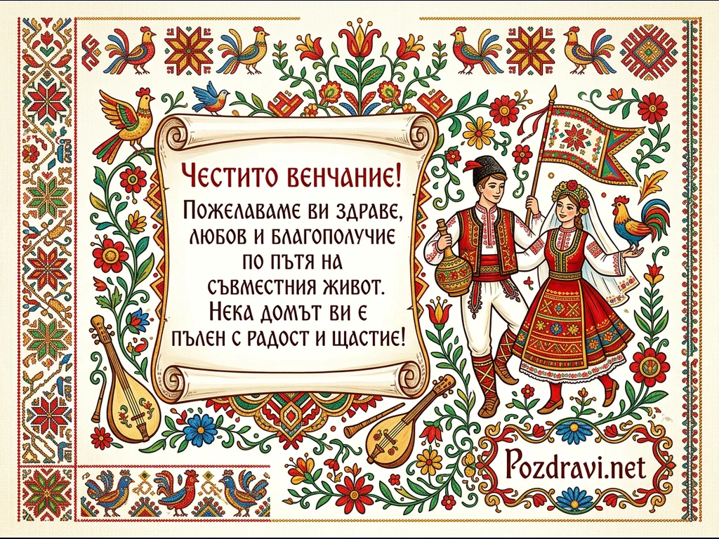 Тази илюстрация е цветна поздравителна картичка в стил българско народно изкуство, посветена на венчание. В центъра ѝ е изобразена млада двойка в традиционни носии, като мъжът държи стомна, а жената – знаме с фолклорни мотиви, до нея стои петел. Основното послание 'Честито венчание!' е изписано на свитък, заобиколен от пищни орнаменти. Цялата композиция е богато украсена с елементи на българска шевица, цветя, птици и музикални инструменти, създавайки празнична и жизнерадостна атмосфера.