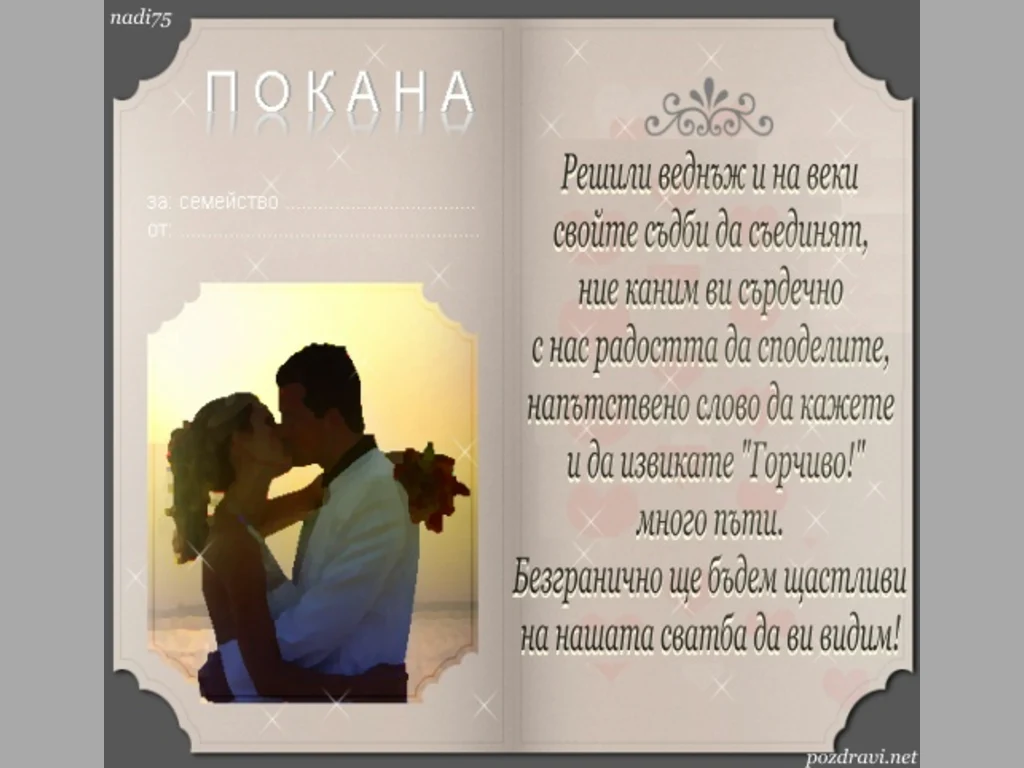 Ключови фрази: сватба, булка, младоженец, покана, картичка, пожелания, тост, поздрав, прегръдка, целувка, любов, вярност, пръстени, брак, семейство, щастие, булченска, рокля, поздравления