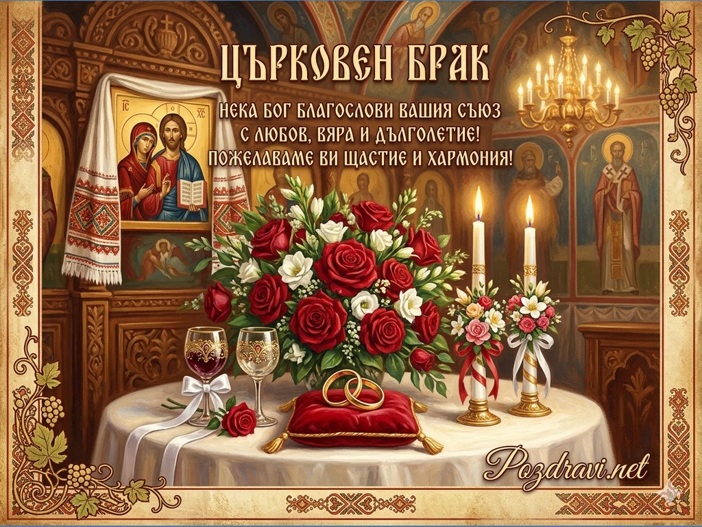 Тази красива поздравителна картичка за църковен брак в пейзажен формат пресъздава тържествената и свещена атмосфера на православния сватбен ритуал, без да изобразява младоженци.