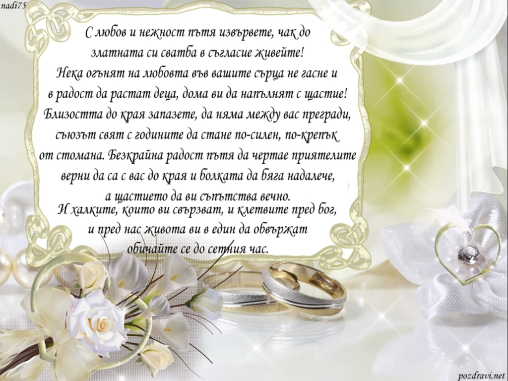 С любов и нежност пътя извървете, чак до златната си сватба в съгласие живейте! Нека огънят на любовта във вашите сърца не гасне и в радост да растат деца, дома ви да напълнят с щастие! Близостта до края запазете, да няма между вас прегради, съюзът свят с годините да стане по-силен, по-крепък от стомана. Безкрайна радост пътя да чертае приятелите верни да са с вас до края и болката да бяга надалече, а щастието да ви съпътства вечно.