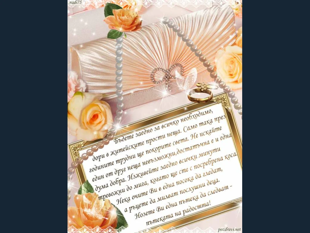 Ключови фрази: сватба, халки, поздрав, пожелание, цветя, рози, перли, наниз, злато, диаманти, рубини, бяла, коприна, сатен, воал