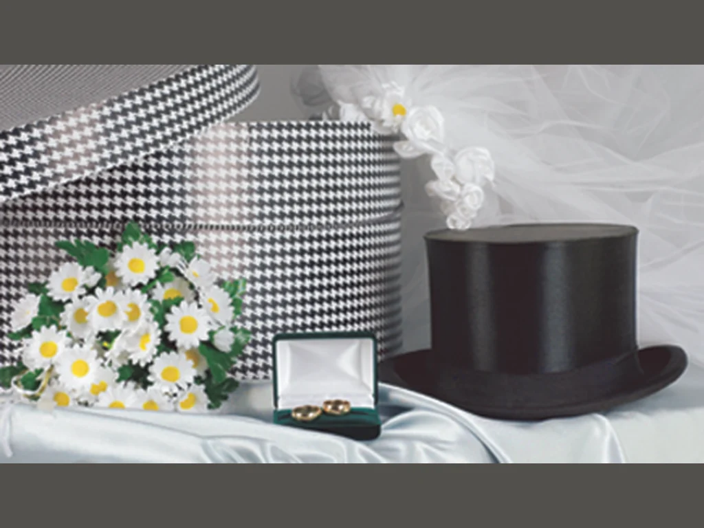 Ключови фрази: свадбен, тоалет, аксесоари, букет, маргаритки, мъжки, целиндър, ръкавели, було, булченска, рокля
