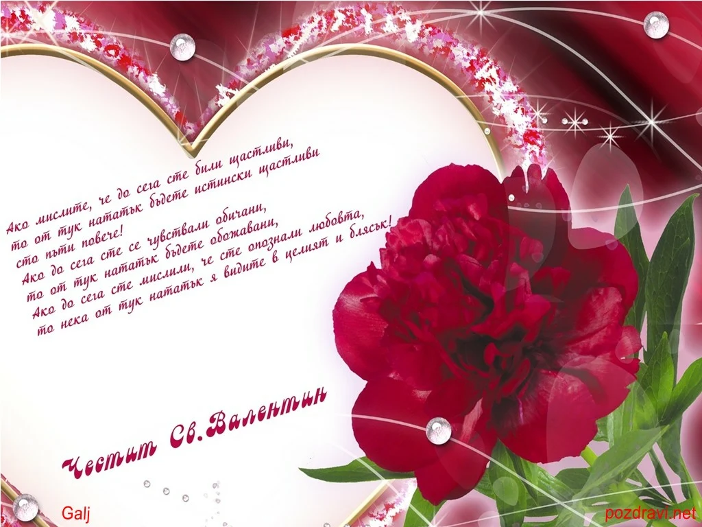 Ключови фрази: Честит празник Свети Валентин картичка алено червен божур звездички сърце пожелание поздрави перлички диаманти красота любов изисканост стил