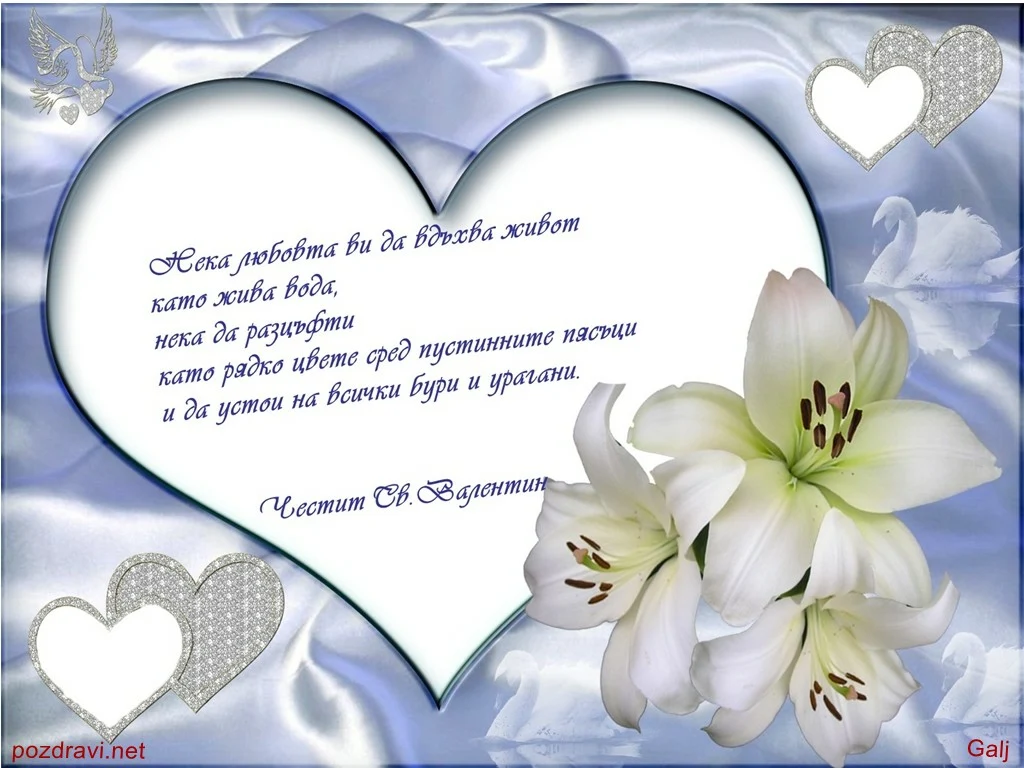 Ключови фрази: Картичка поздрави пожелание Честит Свети Валентин много изискана нежна сияйна бели камелии сърца сатен син красота лебеди диаманти кристали