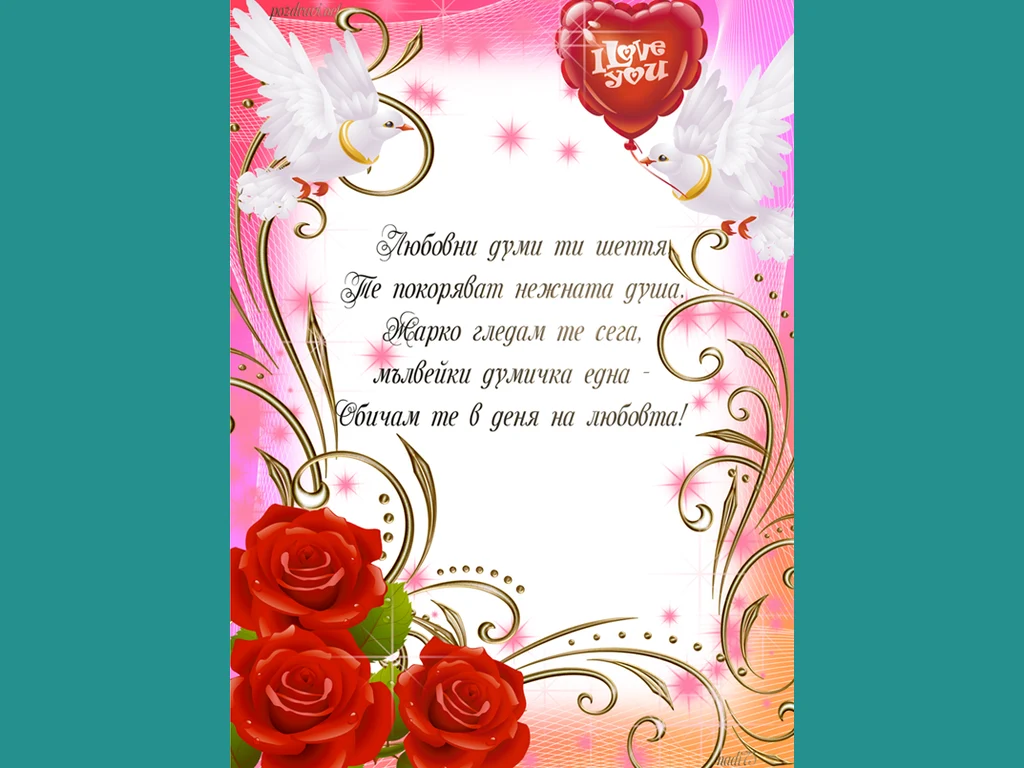Ключови фрази: Картичка любовна свети Валентин алено червени разцъфнали рози два бели гълъба перли заедно завинаги влюбени