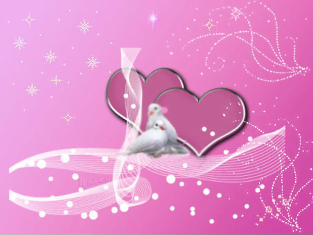 Ключови фрази: Картичка две влюбени бели гълъбчета панделка сърца прегръдка любов лилаво снежинки пожелание поздрави празник Свети Валентин