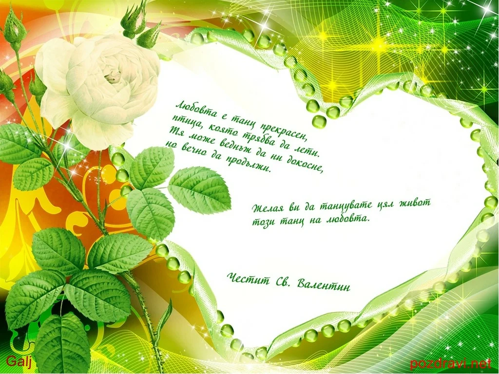 Ключови фрази: Любовта танц прекрасен честит Свети Валентин бяла Разцъфнала роза сияйна магнетична привличаща картичка пожелание поздрави перли диаманти звездички воал жълто зелено оранжево панделки сърце
