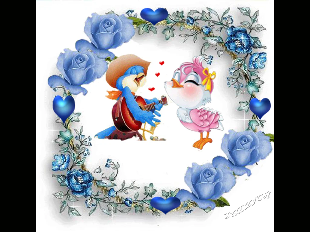 Ключови фрази: Картичка две пеещи щастливи птички винаги заедно китара рози сини влюбени сърца букет цветя червена панделка радост красота любов живот поздрави пожелание весел празник