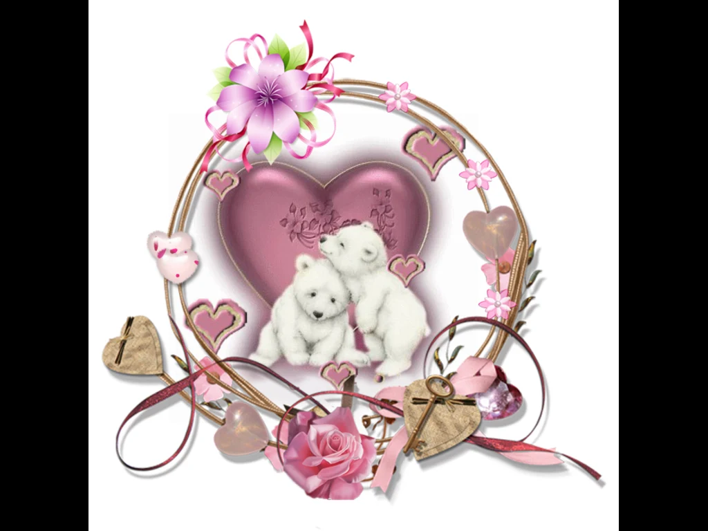 Ключови фрази: Картичка пожелание поздрави две влюбени мечета бели цветя панделки ключ щастие любов вечно заедно сърце
