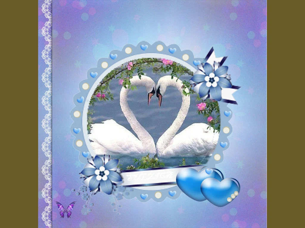 Ключови фрази: Картичка две пеещи щастливи птици бели лебеди винаги заедно влюбени сърца букет цветя червена панделка радост красота любов живот поздрави пожелание весел празник