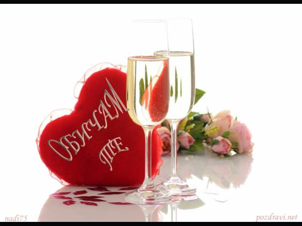 Ключови фрази: Две пълни чаши шампанско наздравица влюбени щастливи букет рози плюшено червено сърце празник свети Валентин поздрави пожелание любов
