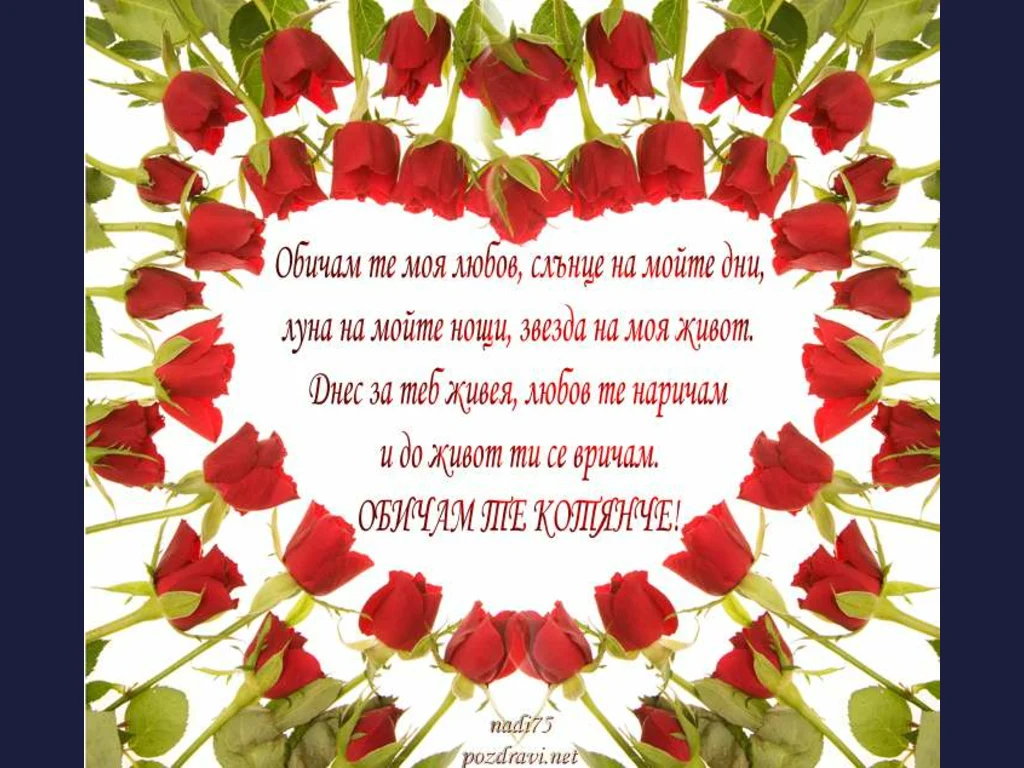 Обичам те моя любов,слънце на мойте дни, луна на мойте нощи, звезда на моя живот. Днес за теб живея, любов те наричам и до живот ти се вричам. ОБИЧАМ ТЕ КОТЯНЧЕ!