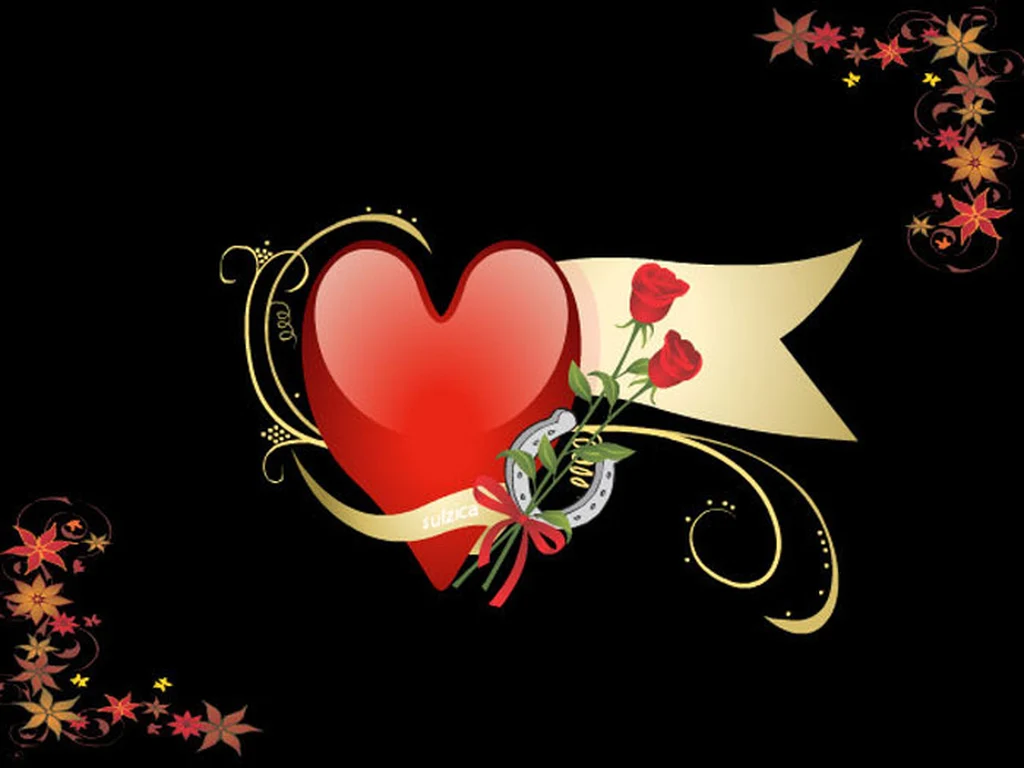 Ключови фрази: Картичка изискана червено сърце алени рози панделка цветя подкова щастие любов