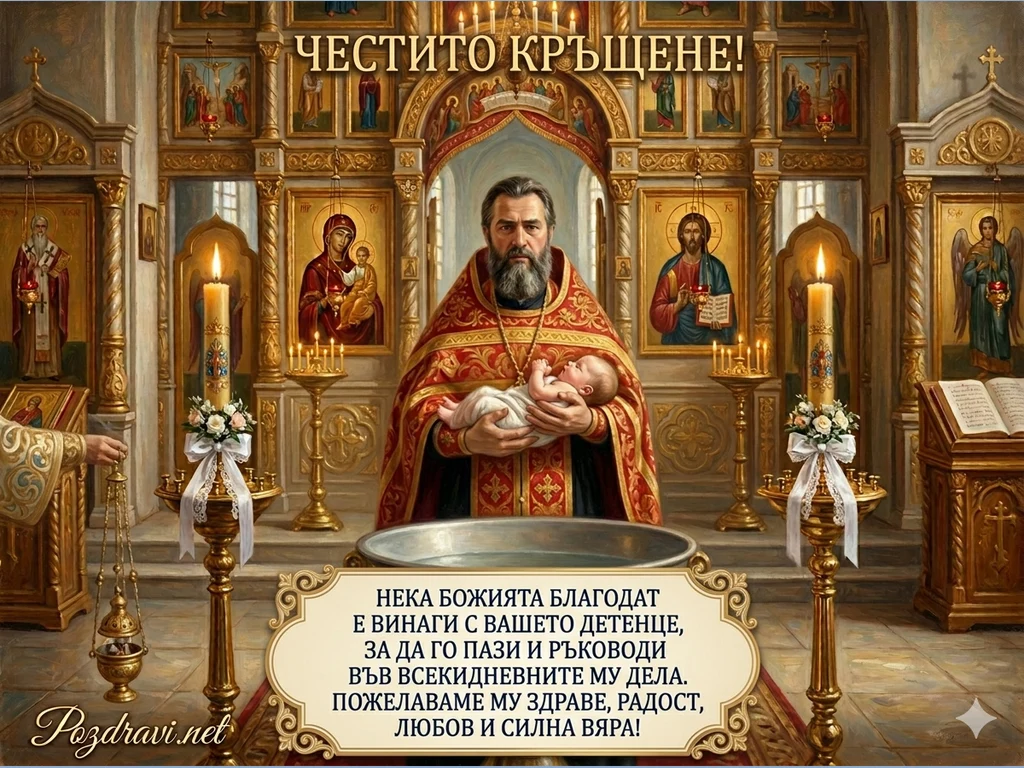 В горната част, над свещеника, се чете тържественият надпис 'ЧЕСТИТО КРЪЩЕНЕ!'.