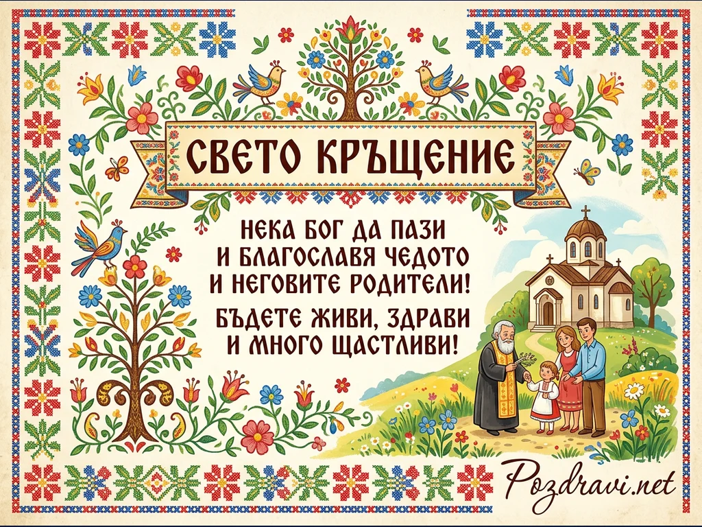 Ключови фрази: Свето Кръщение картичка, Поздравителна картичка кръщене, Българска шевица кръщене, Пожелания за кръщене, Традиционна картичка кръщене