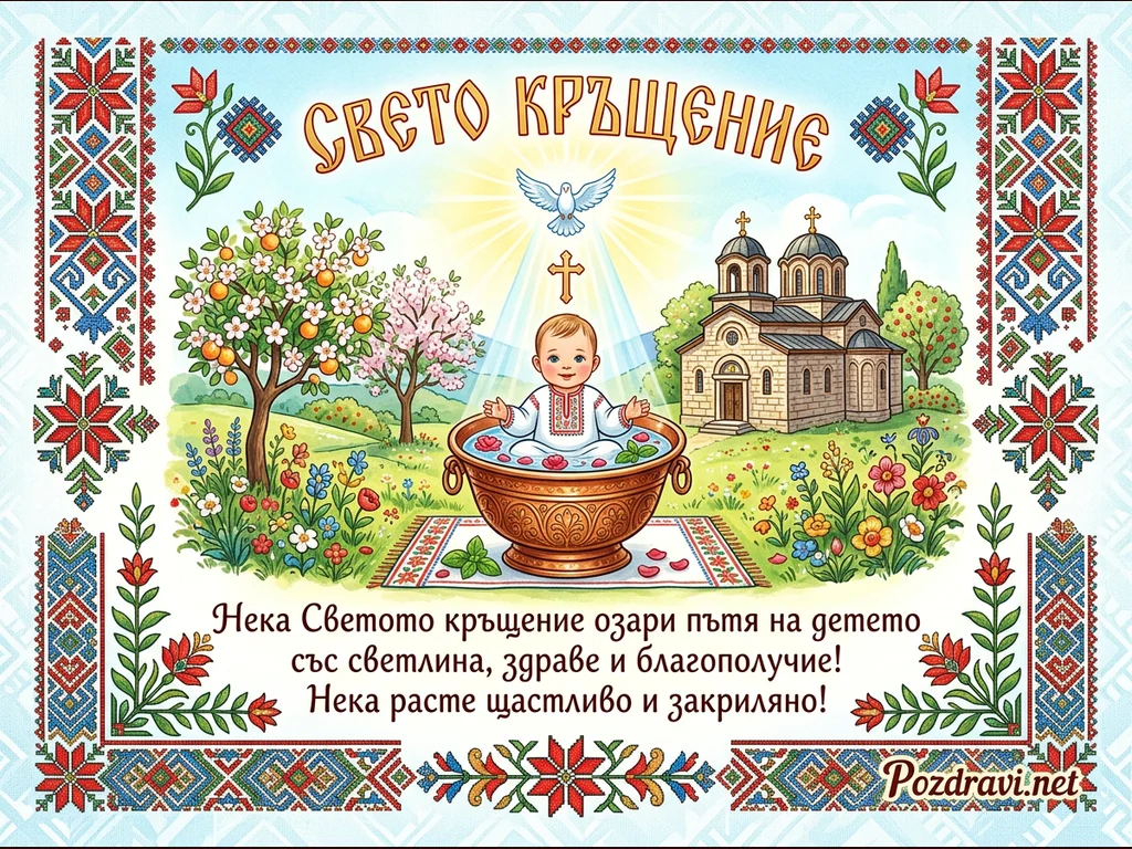 Тази цветна илюстрация е поздравителна картичка за Свето Кръщение, изпълнена с традиционни български мотиви. В центъра е изобразено усмихнато бебе в купел, облечено в народна носия, над което се спуска бял гълъб и свети кръст. Заден план разкрива живописен пейзаж с цъфтящи дървета, поляна с цветя и красива православна църква. Цялата композиция е рамкирана от богати български шевици, а в долната част е изписано пожелание за светъл и благословен живот.