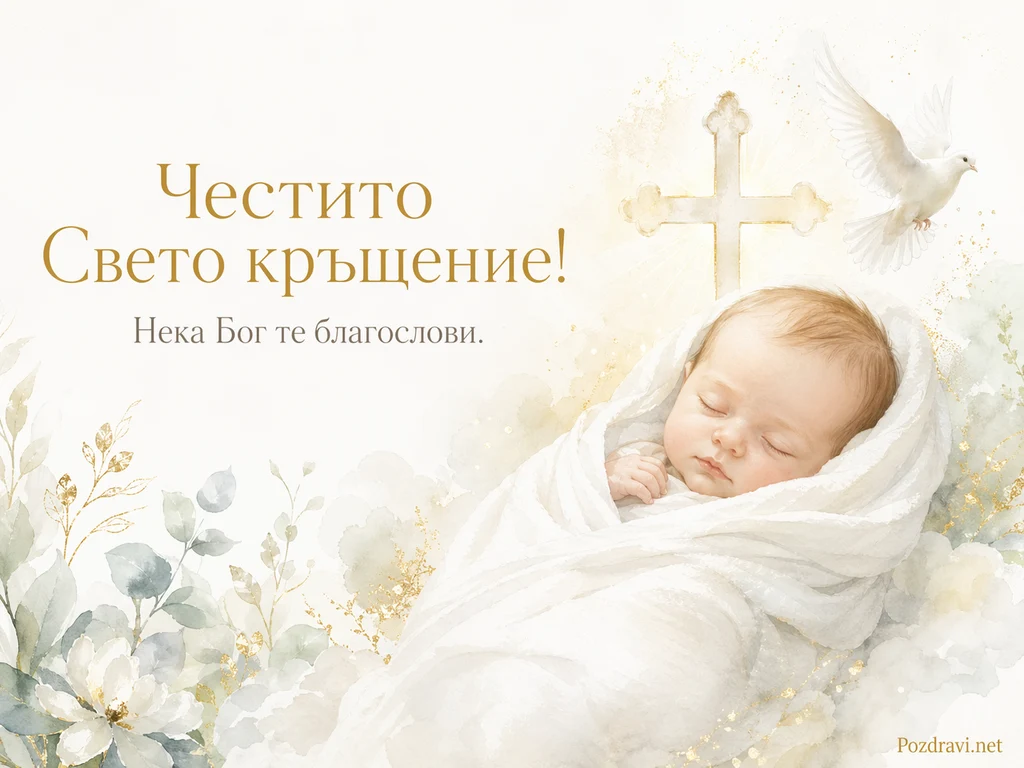 Нежна акварелна композиция в светли кремави и пастелни тонове създава усещане за чистота и благослов. Вдясно спи новородено бебе, увито в бяло одеяло, с отпуснато лице и спокойна поза. Над него се откроява светъл кръст с меки златисти отблясъци, който подсилва религиозния мотив. В горния десен ъгъл лети бял гълъб с разперени криле, сякаш носи мир и надежда. Вляво има деликатни клонки и листа в зеленикаво-сини нюанси, допълнени от светли цветове и златни пръски. Текстът на картичката гласи: 'Честито Свето кръщение!' и под него 'Нека Бог те благослови.' Общото внушение е тихо, топло и тържествено, подходящо за поздрав по повод кръщене.