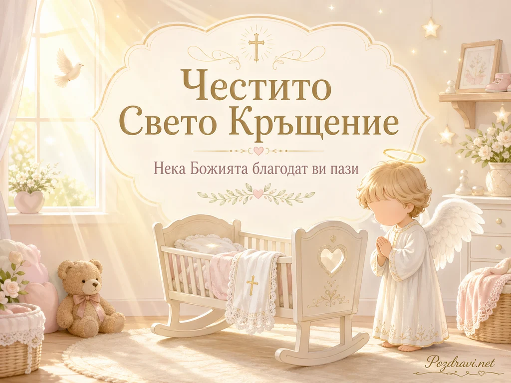 Ключови фрази: ангелче с ореол и криле за свето кръщение, детска стая с бебешка люлка и кръст, текст „Честито Свето Кръщение“ с благослов, християнска сцена с гълъб и светлина