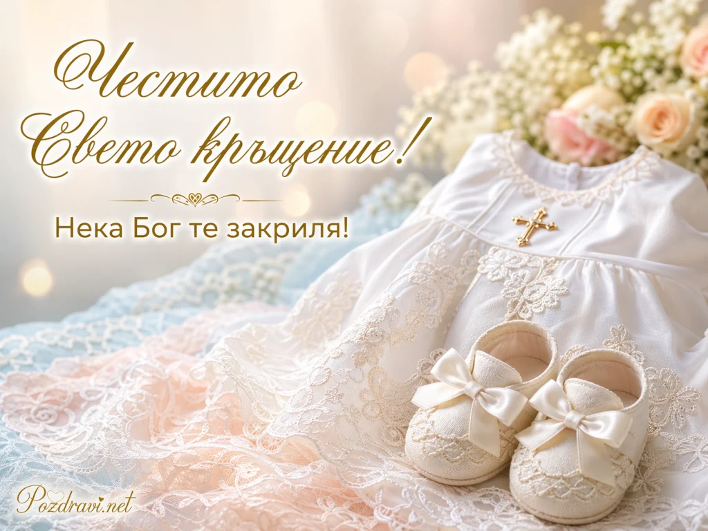 Нежна сцена за свето кръщение е подредена върху дантелена пелена в пастелни синьо и прасковено. Вдясно се вижда бяла кръщелна дрешка с фина бродерия и златист кръст върху гърдите. Пред нея са поставени малки бели обувчици с панделки и дантелени детайли. На заден план има букет с бели цветчета и розови рози, потънал в мек фокус. Фонът е топъл и светъл, с кръгли отблясъци, които създават празнична и спокойна атмосфера. Вляво е изписано: 'Честито Свето кръщение!' и под него: 'Нека Бог те закриля!'.