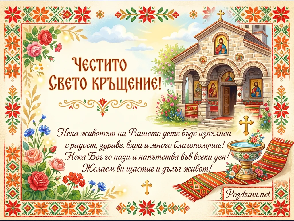 Тази празнична картичка честити Свето Кръщение, изобразявайки живописна църква с икони и златен кръст. Около нея цъфтят розови храсти и сини метличини, а в долния десен ъгъл е показан купел с вода и цветя, върху традиционна българска черга. Рамката е украсена с ярки фолклорни шевици, придаващи автентичен български дух. Централният надпис 'Честито Свето Кръщение!' е допълнен с пожелания за здраве, радост и благополучие на детето.