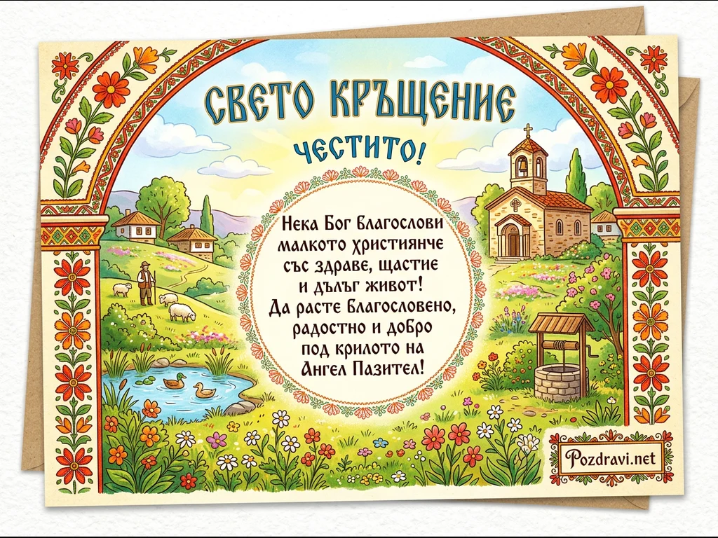 Тази празнична картичка за Свето Кръщение е илюстрирана в живописен фолклорен стил. Тя изобразява идиличен селски пейзаж с традиционни къщи, пастир с овце, езерце с патици и кладенец, а на хълма се издига църква. Цялата сцена е обградена от богато украсена рамка с цветни мотиви, придаващи усещане за българска традиция. В центъра е разположен овален надпис с благослов за здраве, щастие и дълъг живот на кръстеното дете под закрилата на Ангел Пазител. Картичката носи послание за радост и благоденствие.