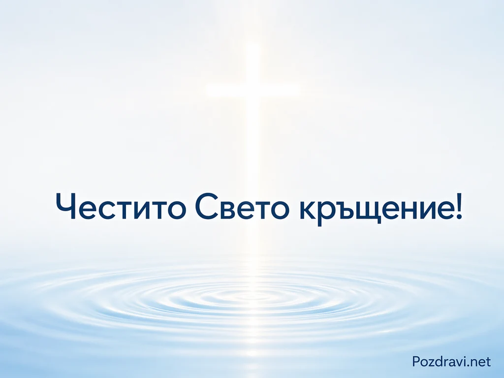 Нежен светъл фон в синьо-бели тонове създава усещане за чистота и спокойствие. В горната част се вижда сияен кръст, от който се разпръсват меки лъчи светлина. Под него централно е изписано 'Честито Свето кръщение!'. Долната половина показва водна повърхност с концентрични кръгове от леки вълнички. Цветовете са пастелни и хладни, с плавни преливки и меко осветление. Композицията напомня за ритуална вода и духовна благословия в тиха, чиста атмосфера.
