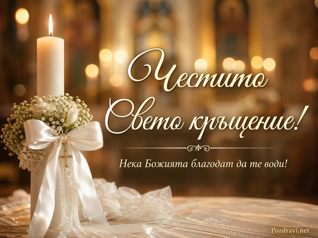 На преден план вляво гори висока бяла свещ, поставена върху маса с бяла дантелена покривка. Около основата ѝ има нежен букет от бели цветя, обвит със сатенена бяла панделка. От панделката виси малък златист кръст, който подсилва църковния и тържествен характер на сцената. Фонът е меко размазан интериор на храм в топли златисти тонове, с много светлинни кръгове от свещи и осветление. В дясната част е изписан голям калиграфски текст: 'Честито Свето кръщение!' Под него, с по-дребни букви, стои посланието: 'Нека Божията благодат да те води!' Общото внушение е за светъл и благословен момент, изпълнен с спокойствие и духовност.
