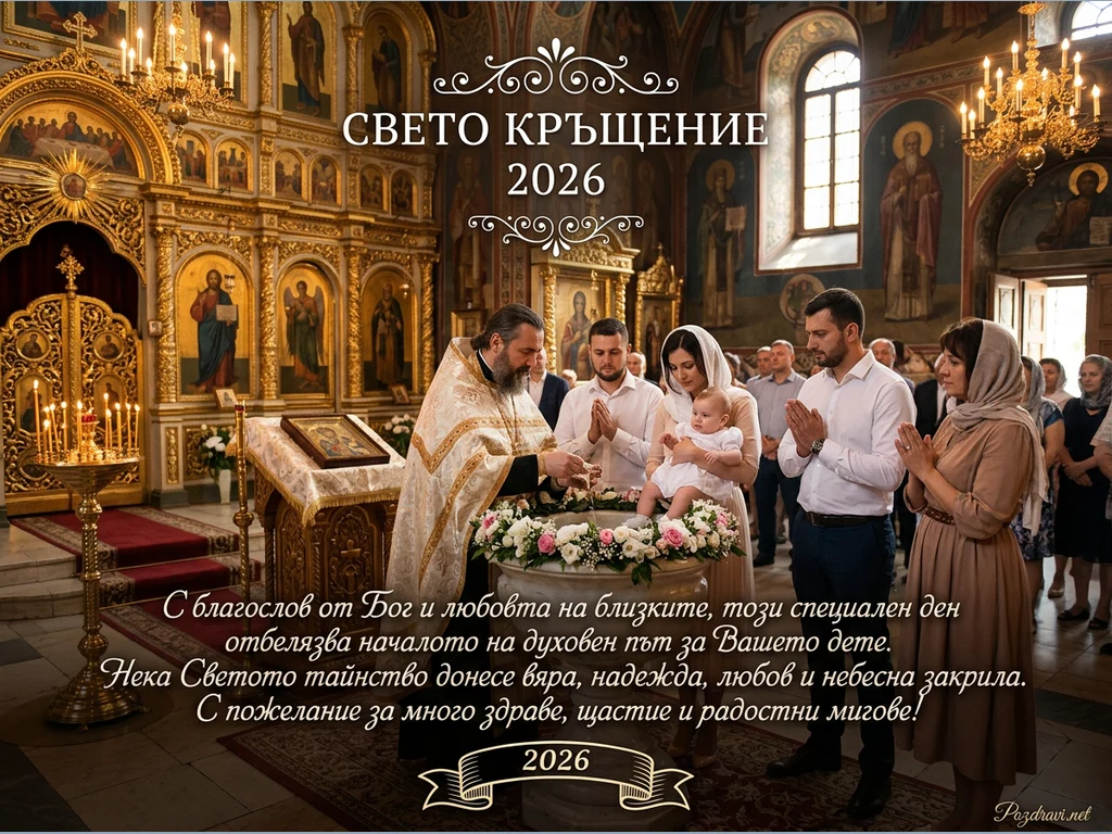 Снимката улавя тържествен момент от православно кръщение, провеждащо се в богато украсена църква. Свещеник в златни одежди извършва ритуала над купел, обсипан със свежи цветя. Около него стоят родителите, държащи бебето, и кръстниците, всички със сключени в молитва ръце. Златният иконостас с множество икони и запалени свещи създава величествена и свята атмосфера, докато присъстващите наблюдават тайнството. На изображението е добавен текст 'СВЕТО КРЪЩЕНИЕ 2026' и пожелание.