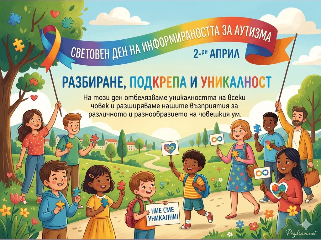 Текстови елементи: В горната част, върху голям цветен банер, е изписано ясно: 'СВЕТОВЕН ДЕН НА ИНФОРМИРАНОСТТА ЗА АУТИЗМА – 2-ри АПРИЛ'. Под него със стилен шрифт са подчертани думите: 'РАЗБИРАНЕ, ПОДКРЕПА И УНИКАЛНОСТ'.