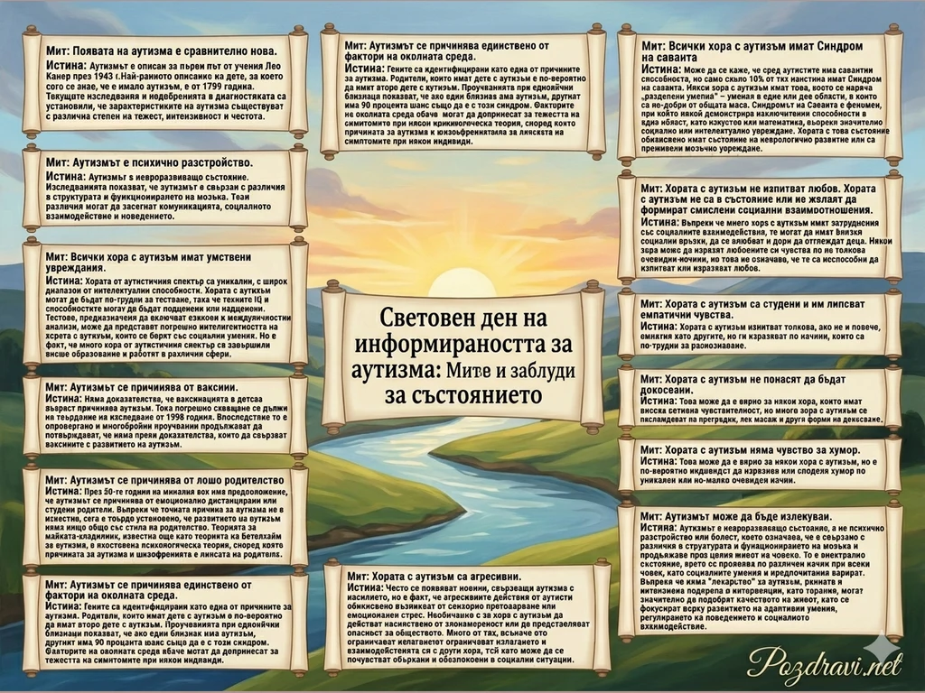 В центъра на картичката, върху централния свитък, е изписано заглавието: 'Световен ден на информираността за аутизма: Митове и заблуди за състоянието'.
