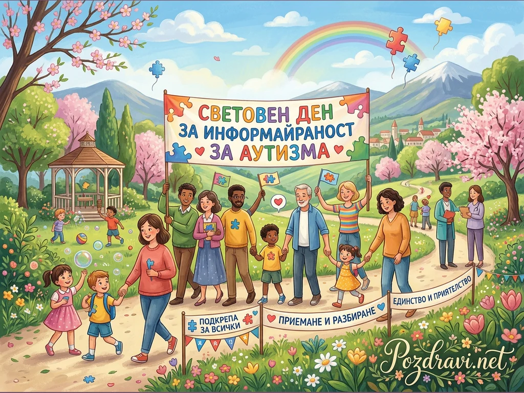Ярка илюстрация показва разнообразна група от хора, включително деца и възрастни, които празнуват Световния ден за информираност за аутизма. Те държат голям транспарант с надпис 'СВЕТОВЕН ДЕН ЗА ИНФОРМАЙРАНОСТ ЗА АУТИЗМА', а пъзел елементи летят във въздуха и украсяват знамената. Сцената е разположена в живописен пролетен пейзаж с цъфтящи дървета, планини, дъга и играещи деца, символизиращи радост и включване. Допълнителни надписи призовават за 'ПОДКРЕПА ЗА ВСИЧКИ', 'ПРИЕМАНЕ И РАЗБИРАНЕ' и 'ЕДИНСТВО И ПРИЯТЕЛСТВО', подчертавайки посланието за толерантност и общност.