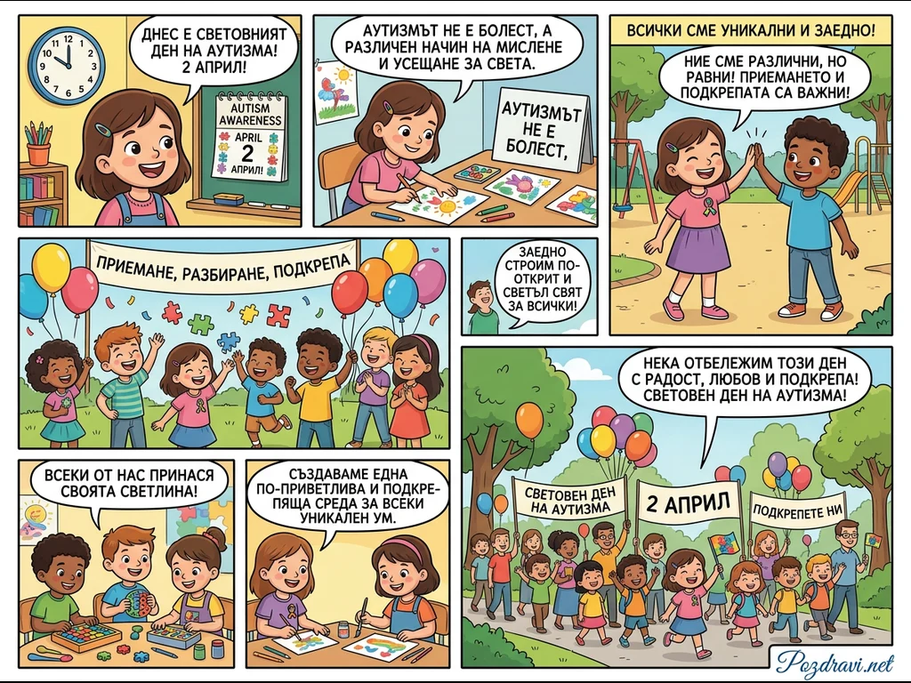 Комиксът показва различни сцени, посветени на Световния ден за информираност за аутизма на 2 април. Деца с различен произход участват в дейности, които насърчават приемането, разбирането и подкрепата за хората с аутизъм. Сюжетът подчертава, че аутизмът не е болест, а различен начин на мислене, и призовава за изграждане на по-приобщаващ и подкрепящ свят. Виждат се деца, които рисуват, играят заедно, правят занаяти и участват в празнично шествие с балони и плакати. Общото послание е за уникалността на всеки, равенството и важността на подкрепата за създаване на приветлива среда.