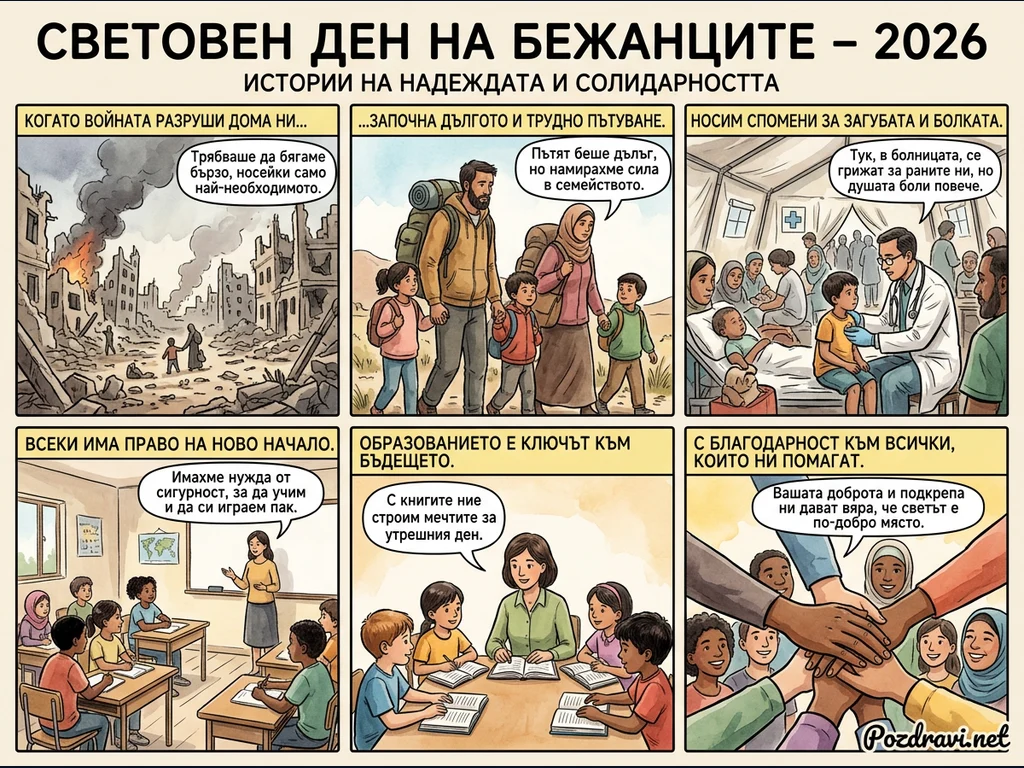 Комиксът 'Световен ден на бежанците – 2026' разказва истории за надежда и солидарност чрез шест панела. Той проследява пътя на бежанско семейство, започващ с бягство от разрушен от война дом и дълго, трудно пътуване. Панелите показват грижата за ранените в болница, както и важността на новото начало, образованието и сигурността за децата. Комиксът подчертава ролята на книгите за изграждане на мечти и завършва с послание за благодарност към всички, които помагат, символизирано от сплотени ръце. Това е силно послание за човечност и подкрепа към бежанците.