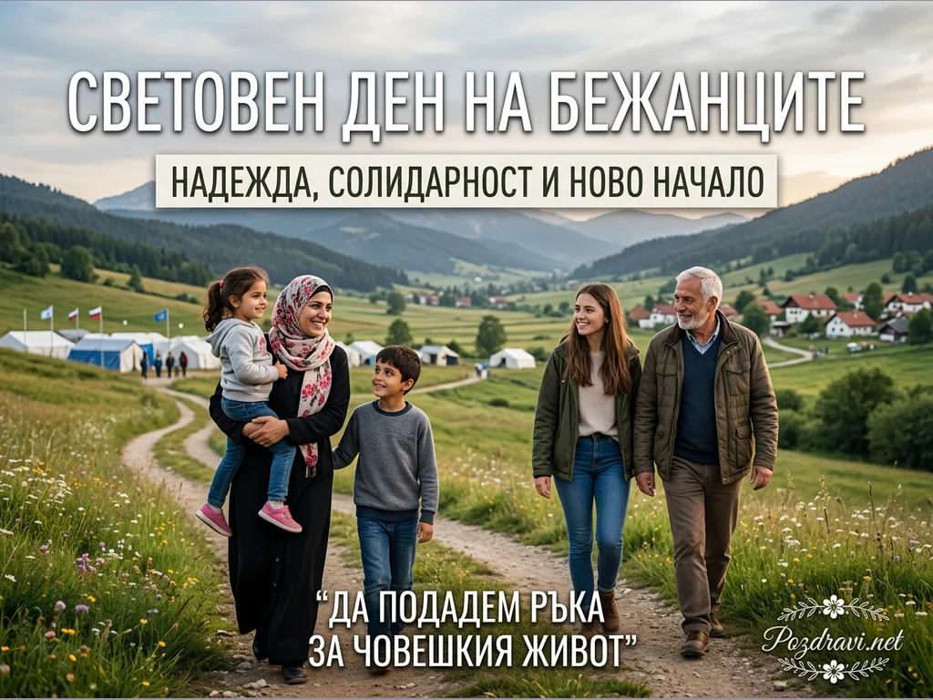 Снимката изобразява две групи хора, вървящи по черен път през живописен хълмист пейзаж с палатки и къщи на заден план. Отляво е семейство бежанци – жена с хиджаб носи малко момиченце, а до нея върви момче, всички усмихнати. Отдясно млада жена и възрастен мъж ги посрещат с топли усмивки, символизирайки солидарност и подкрепа. Надписът 'СВЕТОВЕН ДЕН НА БЕЖАНЦИТЕ: НАДЕЖДА, СОЛИДАРНОСТ И НОВО НАЧАЛО' подчертава посланието за ново начало и човешка помощ. Цялостната сцена предава усещане за общност и надежда в труден момент.