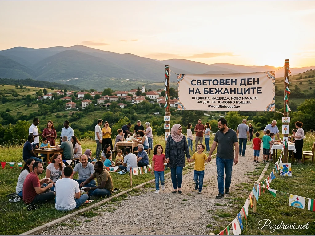 Снимката улавя оживено събиране на открито, където хора от различни възрасти и етноси празнуват заедно на фона на живописно българско село и залеза. В центъра на вниманието е голям транспарант, обявяващ 'Световен ден на бежанците' с послание за подкрепа, надежда и ново начало. Групи хора се хранят на маси, други разговарят, седнали на тревата, а семейство с две деца върви по пътека, украсена с флагове и детски рисунки. Атмосферата е топла и приветлива, символизираща общност и солидарност в красива природна среда.
