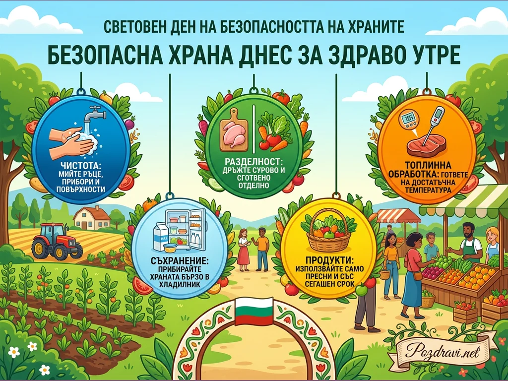 Цветен илюстративен плакат популяризира принципите за безопасност на храните, изобразявайки оживен селски пейзаж с ферма и пазар. В центъра са разположени пет кръгли икони, всяка от които символизира ключов аспект на безопасното боравене с храна: чистота, разделност на сурови и сготвени продукти, топлинна обработка, правилно съхранение и избор на пресни продукти. Плакатът носи посланието 'Световен ден на безопасността на храните: Безопасна храна днес за здраво утре', подчертавайки важността на тези практики. Общата композиция включва българско знаме и хора, ангажирани с различни етапи от производството и консумацията на храна.