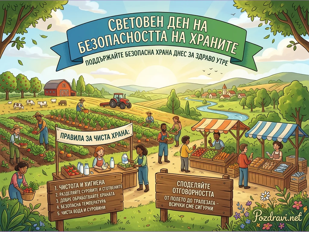 Тази илюстрация показва оживена селска сцена, посветена на Световния ден на безопасността на храните, с надпис 'Поддържайте безопасна храна днес за здраво утре'. Хора от различни възрасти и етноси са заети с отглеждане, приготвяне и продажба на храна – от прибиране на реколтата в полето до пазарни сергии с пресни плодове, зеленчуци, млечни продукти и риба. На преден план дървени табели изброяват 'Правила за чиста храна' и призовават за споделена отговорност 'от полето до трапезата'. На заден план се виждат ферма с крави, трактор, река и малко село, символизиращи целия цикъл на производство на храна. Цялостната композиция подчертава важността на безопасните хранителни практики за здравословно бъдеще.