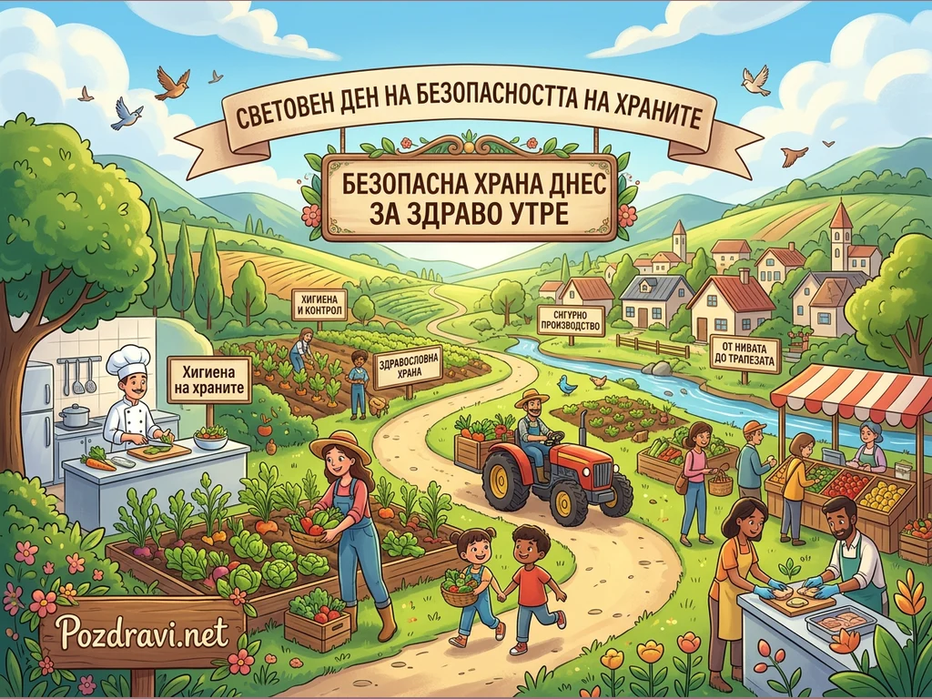 Тази илюстрация в анимационен стил представя живописна селска сцена, посветена на Световния ден на безопасността на храните. Тя проследява пътя на храната 'от нивата до трапезата', показвайки различни етапи като отглеждане на зеленчуци, приготвяне в кухнята и продажба на пазара. Хора от всички възрасти – фермери, готвачи, търговци и деца – участват в процеса, подчертавайки важността на хигиената, контрола и сигурното производство. Общото послание е за здравословна и безопасна храна днес за по-добро утре.