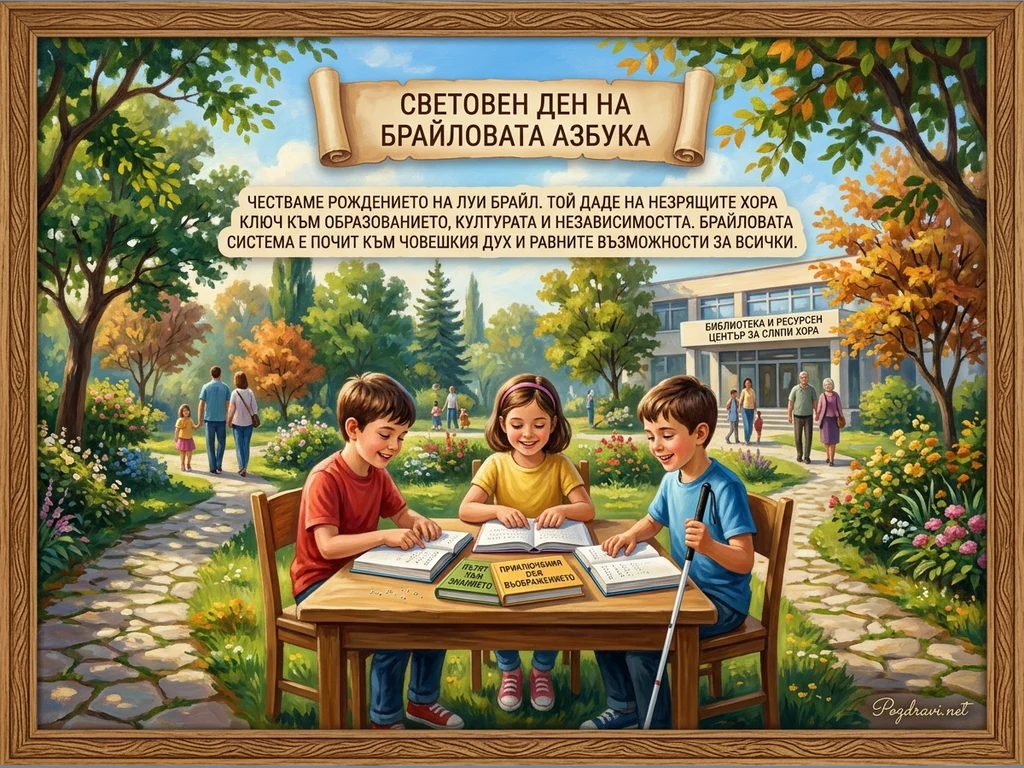 Картината изобразява три усмихнати деца, които четат книги на брайлова азбука около дървена маса на открито. Двама от тях са момчета, едното от които държи бял бастун, а третото е момиче, всичките съсредоточени върху релефния текст. Заден план разкрива живописен парк с буйна зеленина, пъстри цветя и хора, разхождащи се по калдъръмена алея, водеща към сграда, обозначена като 'Библиотека и ресурсен център за слепи хора'. Над сцената се вижда свитък с надпис 'Световен ден на Брайловата азбука' и послание за значението на Луи Брайл за незрящите хора. Цялостната композиция предава послание за образование, равенство и достъпност, подчертавайки радостта от четенето за всички.
