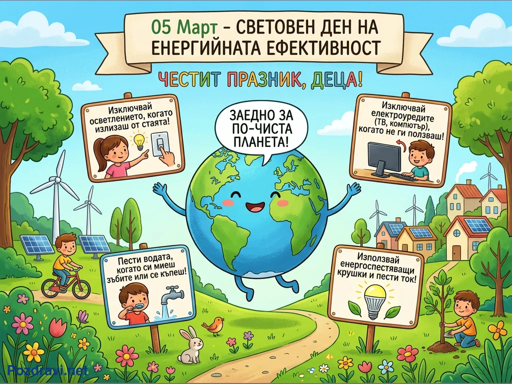 Тази цветна илюстрация в анимационен стил отбелязва Световния ден на енергийната ефективност на 5 март. Тя показва усмихната планета Земя, заобиколена от деца, които демонстрират различни екологични навици. Сред тях са изключване на осветлението и електроуредите, пестене на вода, използване на енергоспестяващи крушки, каране на колело и засаждане на дървета. Фонът включва къщи със соларни панели, вятърни турбини и буйна зелена природа, подчертавайки важността на възобновяемите източници и опазването на околната среда. Посланието 'ЗАЕДНО ЗА ПО-ЧИСТА ПЛАНЕТА!' насърчава децата да бъдат активни в грижата за Земята.