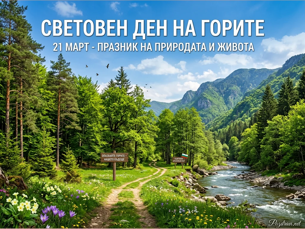 Снимката разкрива живописен пролетен пейзаж с гъста гора, през която се вие черен път. Покрай пътя и брега на реката цъфтят пъстри полски цветя в жълто, бяло и лилаво. Отдясно тече бистра планинска река, а на заден план се издигат величествени зелени планини под ясно синьо небе с бели облаци. На преден план са поставени две дървени табели, едната с призив за опазване на горите, а другата с надпис 'БЪЛГАРИЯ БЛАГОДЕНСТВА' и български флаг. В горната част на изображението е изписано 'СВЕТОВЕН ДЕН НА ГОРИТЕ' и '21 МАРТ - ПРАЗНИК НА ПРИРОДАТА И ЖИВОТА'.