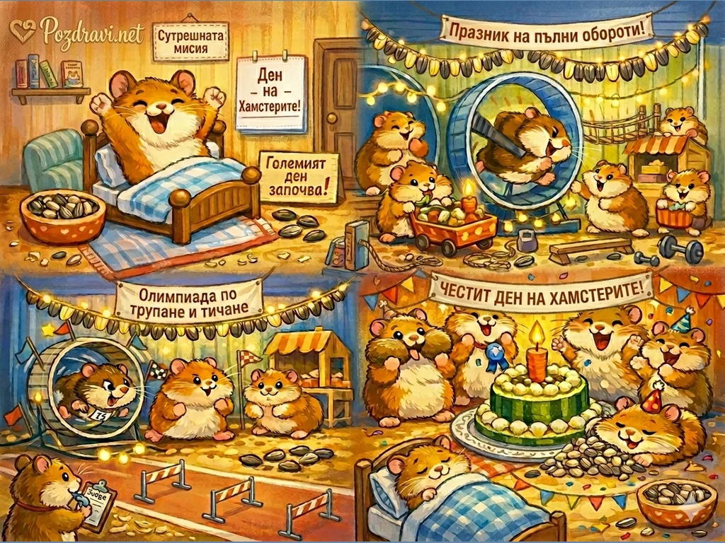 Весел комикс в четири ясно отделени сцени показва как пухкави хамстери празнуват своя специален ден с много настроение и комични физиономии.