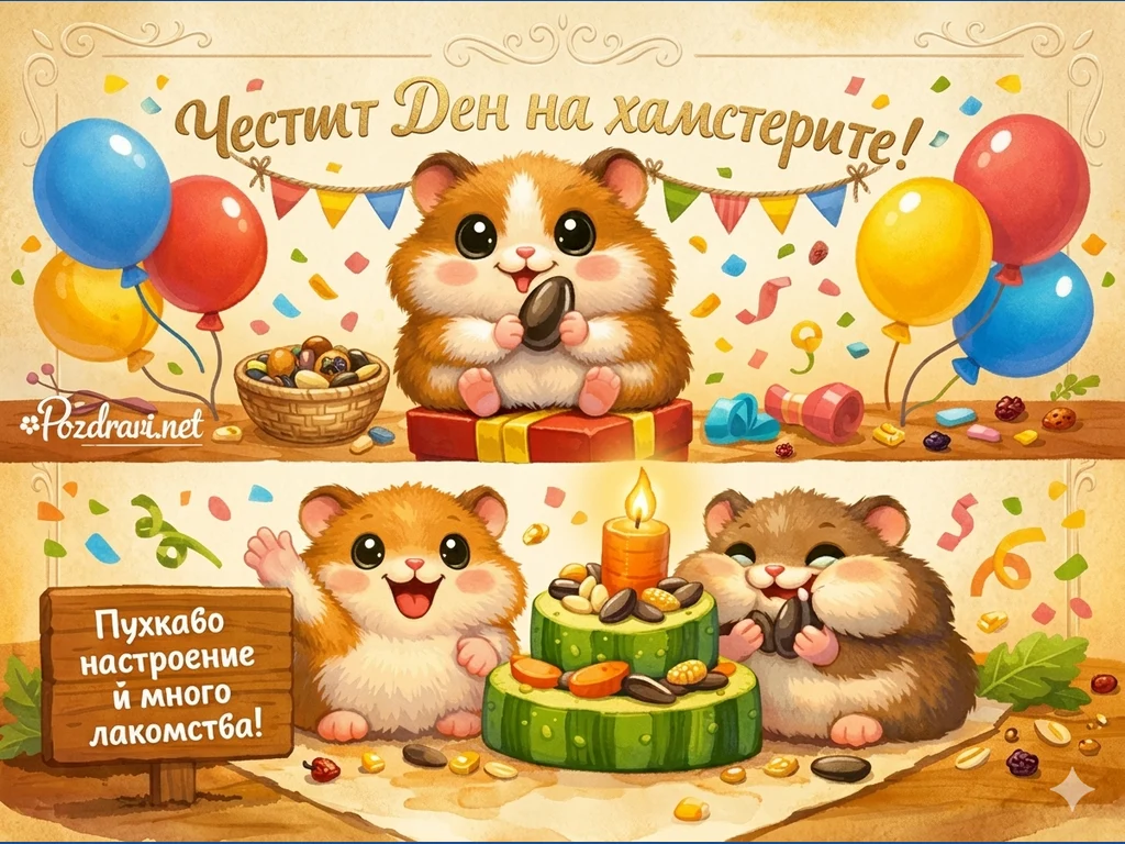 Весела двусценна илюстрация показва пухкави хамстери в празнична атмосфера с балони, конфети и вкусни лакомства.