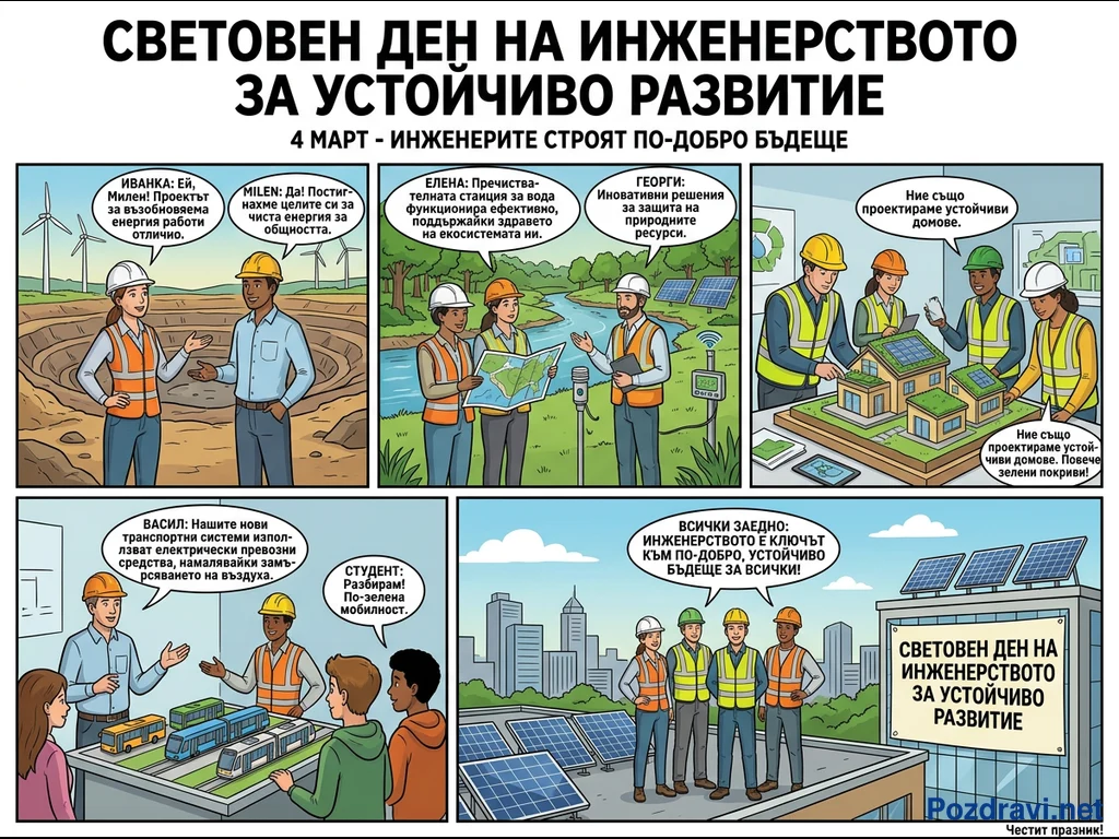 Този комикс отбелязва Световния ден на инженерството за устойчиво развитие, представяйки разнообразни примери за приноса на инженерите. Той показва специалисти, работещи по проекти за вятърна енергия, пречиствателни станции за вода, устойчиви домове със зелени покриви и соларни панели. Изобразени са също инженери, разработващи електрически транспортни системи за намаляване на замърсяването. Комиксът подчертава, че инженерството е ключово за изграждането на по-добро и устойчиво бъдеще за всички.