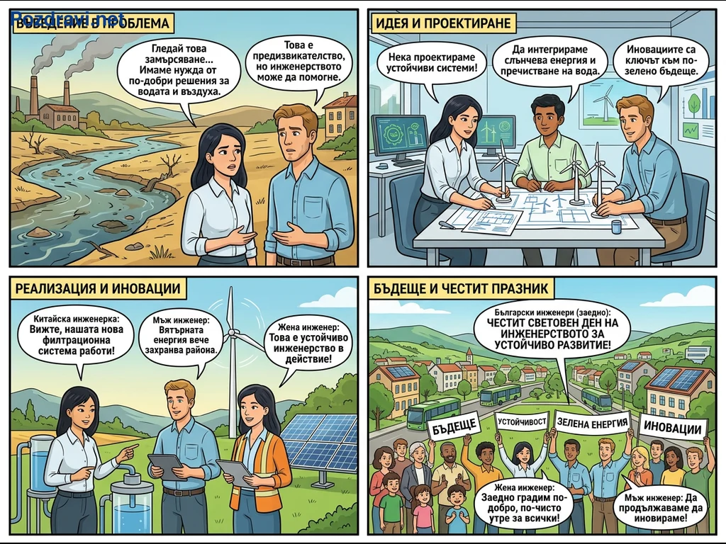 Комиксът проследява пътя на инженерството към устойчиво развитие, започвайки с проблема със замърсяването на водата и въздуха. Инженери обсъждат и проектират иновативни решения, включващи слънчева енергия, пречистване на вода и вятърни турбини. Следващата фаза показва реализацията на тези зелени технологии, като работеща филтрационна система и възобновяеми енергийни източници. В последната сцена, общност от хора празнува чистото бъдеще, постигнато чрез устойчиво инженерство, отбелязвайки Световния ден на инженерството за устойчиво развитие.